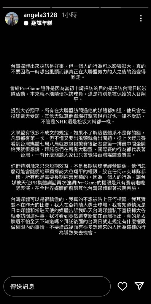 道奇隨隊記者Angela Wu也在IG限動提及:「大聯盟有很多不成文的規定,如果不了解這個體系不是你的錯,凡事都有第一次,但不懂又要出風頭就會出問題。從上次經典賽看到台灣媒體七局八局就放包包搶賽後記者會第一排最中間坐開始我就很想說,拜託你們在所有大聯盟、國際賽的行為都代表著台灣,一有什麼問題大家也只會覺得台灣媒體素質很差。」