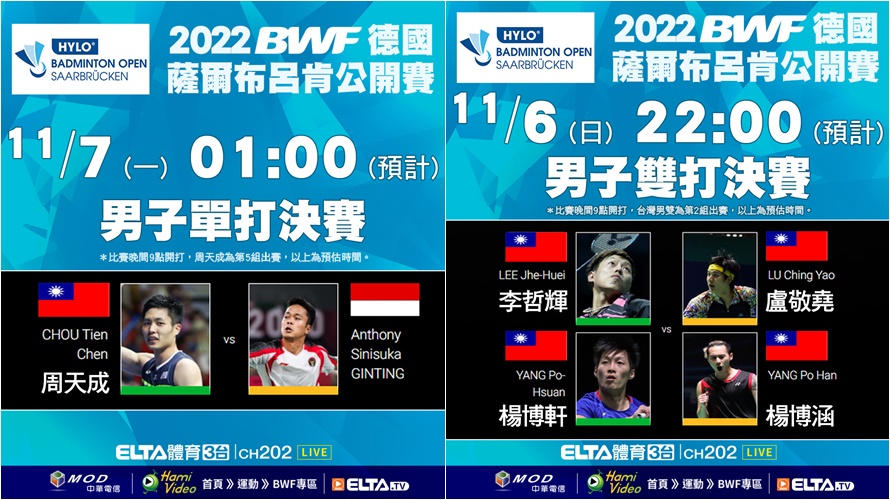 ▲周天成與台灣男雙內戰播出時間。(圖/翻攝自愛爾達臉書)