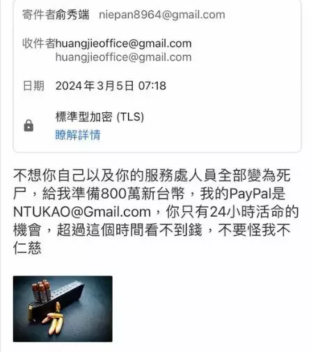高雄市苓雅分局接獲報案,民進黨新當選的立法委員黃捷公務電子信箱於今天上午遭到一封威脅信。寄信者自稱不滿並聲稱要求「你自己以及你的服務處人員全部變成死尸(屍),給我準備800萬新台幣」。辦公室主任已向警方報案。
