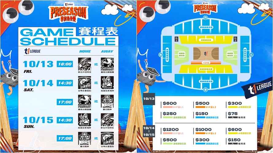 T1 League 2023-2024賽季季前熱身賽將於10月13日至15日,在新北市新莊體育館註冊開學,本季聯盟迎來話題新生「臺北戰神」以及重組全新面貌的「台啤永豐雲豹」,將與校園風雲人物交手,帶來三天五場賽事。除此之外,聯盟推出多種應援席次與優惠方案,邀請新舊同學進場熱力應援,一起驗收五支球隊今夏的自修成果有多讓人「想不到吧!」