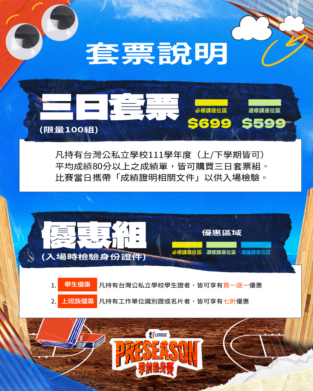 因應觀賞族群年齡層年輕化,聯盟規劃學生買一送一優惠票入場,憑票並出示學生證即可帶一位同行友人入場!更推出限量三日套票組,凡持有111學年度平均成績80分以上之成績單,皆可購買特殊優惠三日套票組。另外必備的上班族優惠票也依然存在,出示工作單位識別證或名片,皆可享有全區七折優惠,提供球迷不一樣的賽事購票選擇。