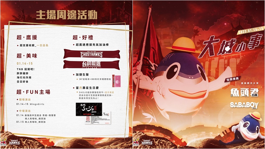 臺南台鋼獵鷹今年再度與臺南觀旅局合作,於1月14日、15日聯手推出「大城小事」主場週,去年是帶大家認識臺南與新成軍的台鋼獵鷹,而今年目的要顯露出臺南人真實心境,首日由臺南觀旅局郭貞慧局長開球,以及臺南最夯吉祥物魚頭君擔任特別來賓,15日則有神秘嘉賓蒞臨開球,另外兩日中場邀請主場強棒主持人魏買加帶領在地擁有嘻哈圈最強高中生稱號的青蛙與格蕾普在主場開唱,將氣氛沸騰到最高點。