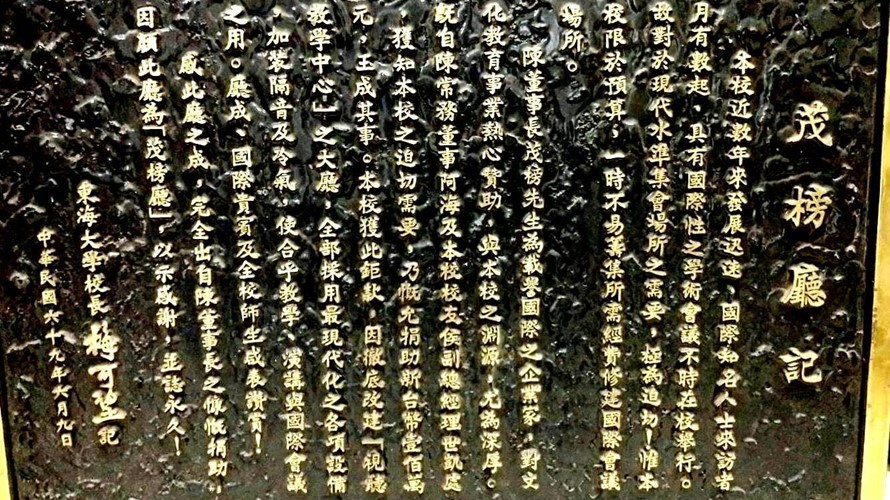 ▲「茂榜廳記」前東海大學校長梅可望於中華民國69年6月9日所撰寫,感謝陳茂榜先生當年慨捐東海大學之茂榜廳。