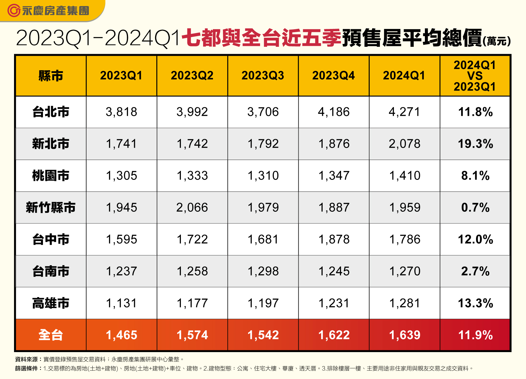受益於台灣經濟景氣復甦、資金充沛影響,2024年Q1預售屋市場大爆發!永慶房產集團統計近五季七大都會區以及全台的預售市場表現,2024年Q1全台交易量較去年同期成長超過1倍、總銷金額成長124.8%!其中高雄市預售表現最為突出,今年Q1交易量較2023年同期成長近2倍,總銷金額的年增幅更達到驚人的238.8%!
