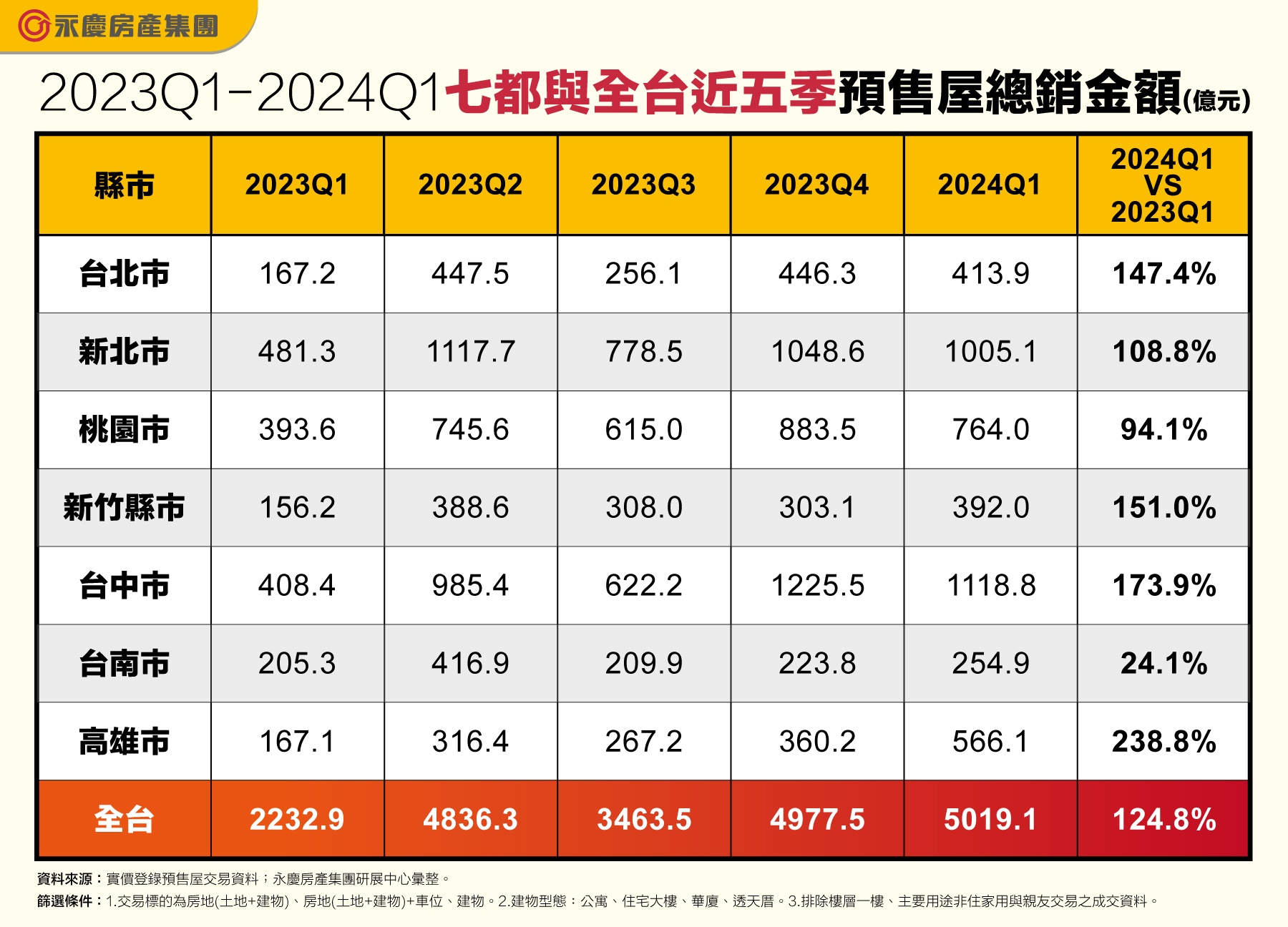 預售市場大爆發!全台2024 Q1交易件數年增破100%! 2024 Q1全台預售住宅總銷金額突破5千億元!創歷史新高