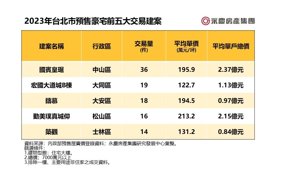 2023年台北市前五熱銷預售豪宅建案出爐! 「國賓皇琚」平均每月賣3戶 「勤美璞真城仰」有價有量