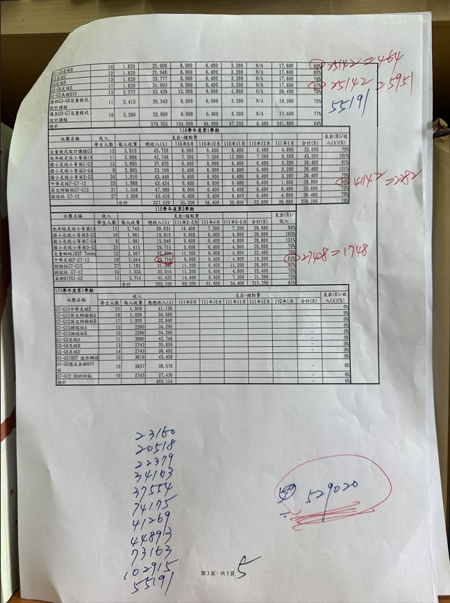 家長透過管道取得104到109學年的社團參與人數與收支明細表以及108到109學年雙語部社團收支明細表(上、下),經比對後發現疑似有超收課後社團經費狀況,雙語部主任陳昭旼也疑似濫用社團款項。讀者提供