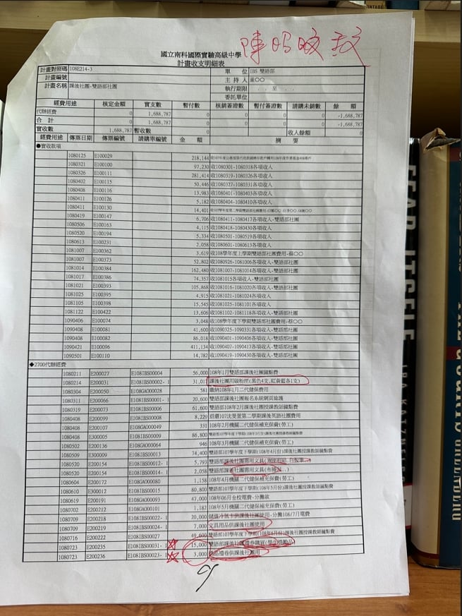 王姓家長也指控雙語部前主任陳昭旼濫用社團經費,他說,陳在108到109學年間挪用社團經費購買圖書禮券、辦公室文具,甚至是防疫用的耳溫槍、試劑等。王姓家長認為,辦公室文具、防疫用品是學校經常性支出,陳昭旼不向校方申請購買卻用社團經費支出,違反常理。