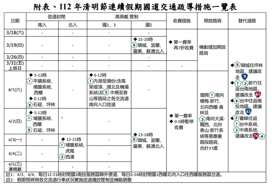 清明節連假為112年4月1日至5日,共計5天,清明節為收假日。高速公路局(高公局)就預估假期交通量為110~124 mvk(百萬車公里);其中首日南向可達73mvk,為平日的1.6倍,接近歷史最大量。高公局檢視歷年清明節連續假期交通狀況,研判清明節連續假期以掃墓、返鄉及旅遊旅次為主,假期首兩日以南向車流為主,末三日以北向車流為主。另為鼓勵民眾提前1、2週休掃墓,故本次疏導措施包括清明節連假前1、2週休(112年3月18日、19日及26日),採單一費率再7折收費,以鼓勵提前掃墓分散連續假期車流。