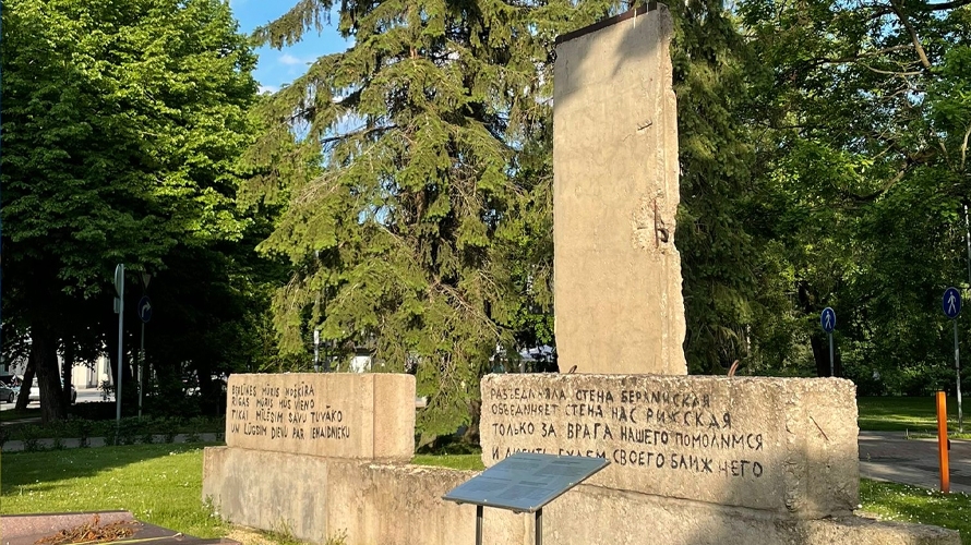 早在1990年,拉脫維亞即舉辦了一項特展,響應東歐民主自由及獨立覺醒運動,最具特殊意義的是特展中陳列一塊經拆除的柏林圍牆原石。1992年,這一塊柏林圍牆原石與在「路障事件」中阻絕蘇聯紅軍入侵有功的混凝土石塊(兩塊)同獲安置在里加市使館區緊臨伊莉莎白街的克羅瓦達公園(Kronvalda Park)內,拉國政府用心良苦地將石碑設立在蘇聯蘇維埃時期拉脫維亞共產黨中央委員會(Central Committee of the Latvian Communist Party)總部(也是蘇聯在拉國的最後據點)所在世貿大樓的右前方。