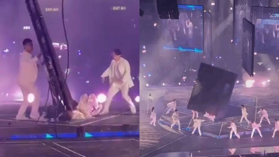 ▲2名舞者遭巨型屏幕砸中,演唱會中斷。(圖/取自微博)