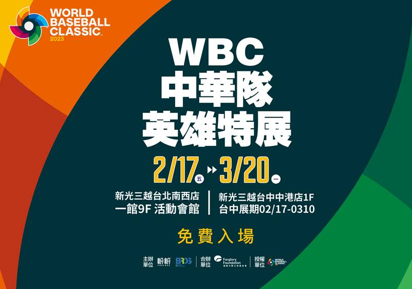 《WBC中華隊英雄特展》由FANFANS粉粉首次取得經典賽官方授權,和悍創運動行銷、遠雄文教公益基金會共同合作,邀請球迷來到特展,一齊回顧中華隊出征世界賽事的種種精采時刻。將於2月17日同步在台北、台中新光三越同步開跑。在台北南西店的現場,有著四大展區,包含:歷史回顧區、特展限定展品區、影片播放區、打卡互動區,除了細細重溫經典賽與中華隊的榮耀時光,過去球員們使用的球具和賽事紀念錦旗也將限定展出!另外,還可以到打卡互動區和球員和女孩的等身人形立牌合照,一起為中華隊應援加油!