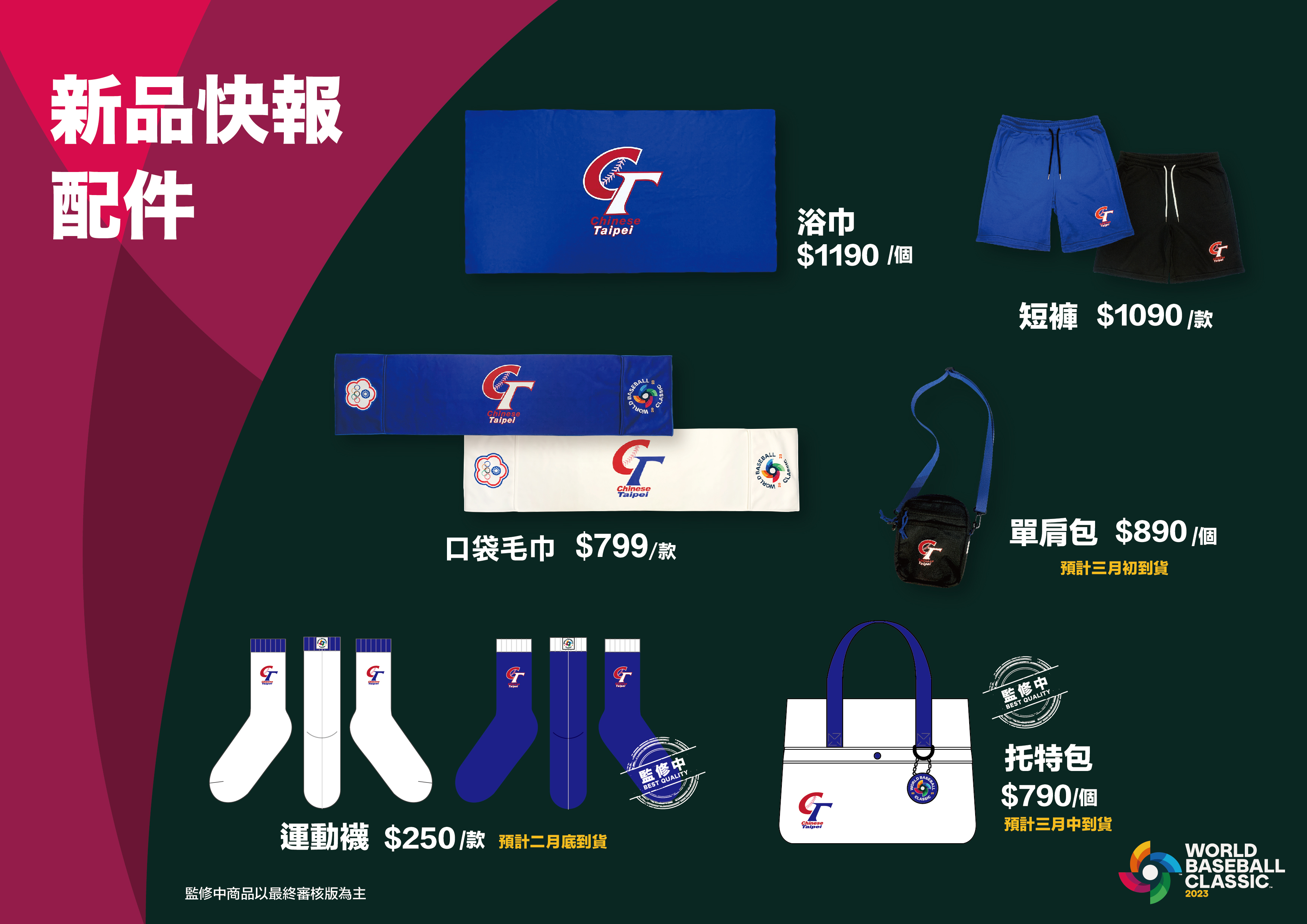 官方授權的紀念周邊也將在球場現身,從2月25日到28日連續四天,於新北市立新莊棒球場的自辦熱身賽;還有在臺中洲際棒球場,3月5日、6日兩天的官辦熱身賽及3月8日至12日的正規分組賽,現場都將規劃經典賽商品的販售區,用最接近的距離,在現場和大家一同為中華隊全力加油!