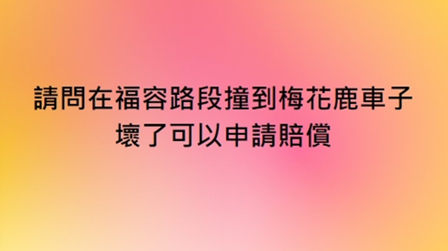 有民眾在臉書社團「恆春半島公共事務討論社團」裡發問,「請問在福容路段,撞到梅花鹿,車子壞了可以申請賠償嗎?」民眾表示,當時天色已晚,光線不佳,來到轉彎處,才發現梅花鹿在馬路上,因此發生車禍,車子左邊有明顯刮痕,當時車上三人都嚇壞,由於是計程車,擔心會影響到過年,沒辦法賺錢。