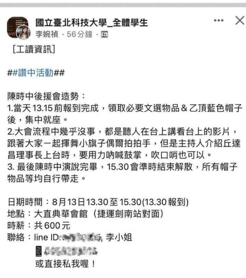 ▲網路上流傳工讀貼文的PO文(圖/翻數自楊植斗臉書)