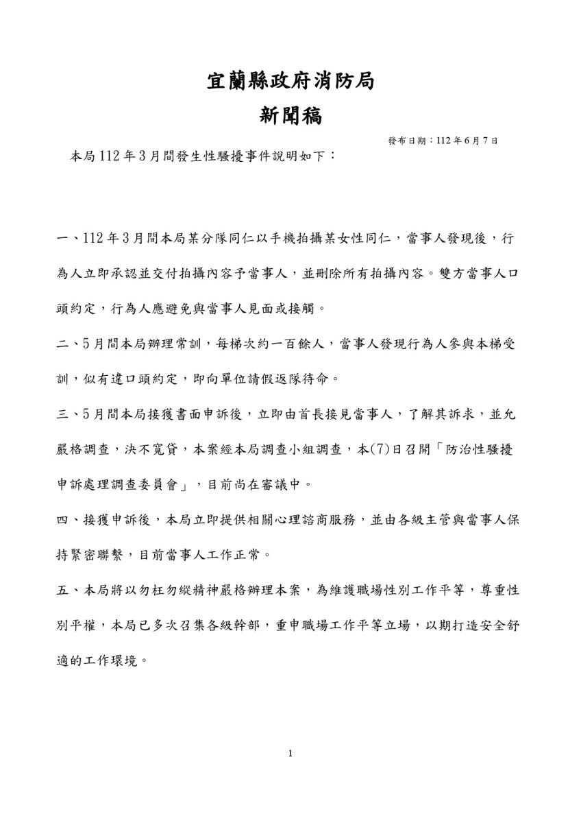 ▲消防分隊長潛入宿舍偷拍女隊員睡覺,宜蘭縣政府消防局7日召開調查委員會,並發新聞稿說明案情。