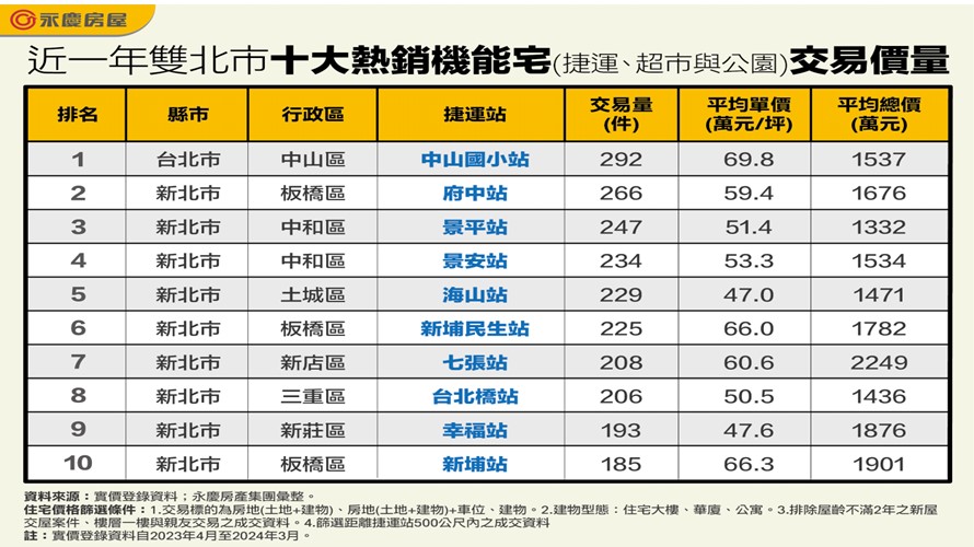 一般民眾賞屋時,最在意的三大生活機能通常為「通勤便利」、「日常採買」、「綠地空間」。永慶房屋根據實價登錄資料,統計台北捷運各站周邊500公尺內擁有超市與公園的站點,並篩選出近一年房市交易量前十名。其中,中山國小站榮登房市交易排行第一名,也是台北市唯一上榜的捷運站,近一年交易量292件。至於土城區的海山站、新莊區的幸福站,近一年仍有4字頭房價,是榜單中房價最為實惠的站點。