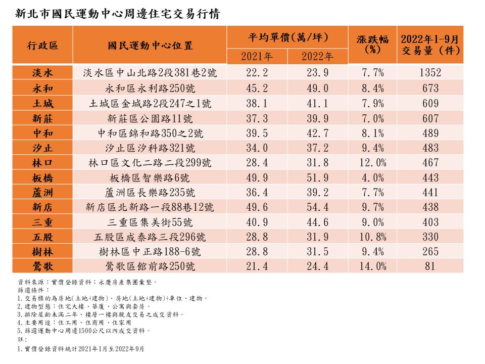 至於新北市,交易件數最多的區域,就屬淡水國民運動中心周邊,交易件數達1352件,是第二名的兩倍之多。陳金萍分析,淡水國民運動中心可說是淡海新市鎮內的公共建設之一,此處規劃為住宅區,居住於附近的民眾能就近前來運動。另外,周邊有家樂福、新市國小、行政機關、淡海輕軌淡水行政中心(V07)站,全部在走路10分鐘以內的距離。
