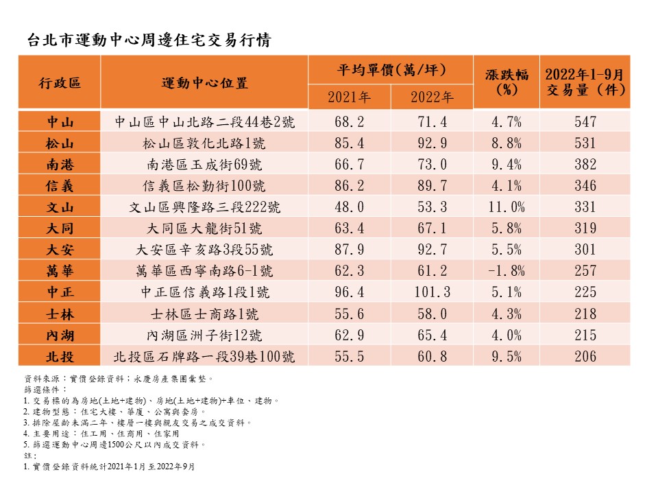 永慶房產集團依據實價登錄資料,統計雙北市各運動中心周遭房市交易數據。在台北市,交易量排名第一的是中山運動中心周邊,以547件獲得「最受歡迎運動宅」。陳金萍說明,中山運動中心周邊是台北市較早開發的區域、商店林立。另外,中山區的產品多元,可以滿足不同族群的居住需求。有適合小資或單身族群的「低總價套房」,今年成交件數達244件;同時也有適合小家庭的兩房或三房,成交件數合計起來也在200件以上。生活便利加上各種房型應有盡有,從成交件數可以看出中山運動中心周邊的客群廣大,是民眾購屋時的優質選項。
