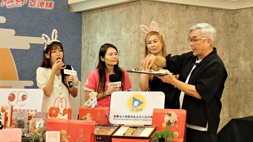 ▲焦哥(右1)及阿娟(右2)介紹《財團法人桃園市私立方舟啟智教養院》帶來的中秋禮盒,滿滿的內餡一點都不含糊!馬妹(左1)正忙著一口接一口的吃直呼「太好吃了!」,左2為廖心慈院長。。(圖/好好聽文創)