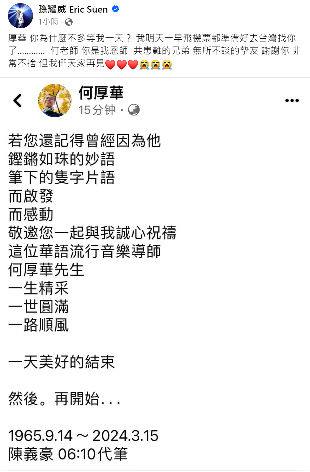 何厚華的臉書由音樂人陳義豪代筆發布了確認其逝世的聲明。對於這一消息,視何厚華為恩師的孫耀威在臉書上表達了難以言喻的悲痛之情,他寫道:「厚華,你為什麼不多等我一天? 我明天一早的飛機票都已準備好要飛往台灣找你了。何老師,你是我親愛的恩師、共同經歷風雨的兄弟,也是我無所不談的摯友,謝謝你!非常不捨,但我們會在天堂再相見。」