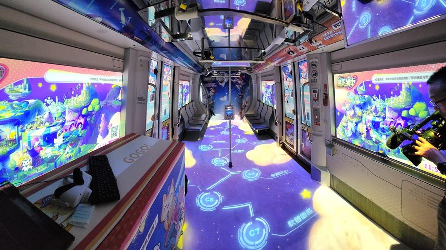 高雄限定輕軌沉浸式投影,讓乘客彷彿置身於虛擬世界中。(圖/高雄市經發局提供)