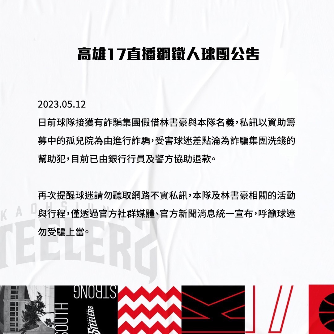近日出現詐騙集團假借林書豪與高雄鋼鐵人球隊名義,私訊球迷要求資助籌募孤兒院來進行詐騙,讓球迷差點成為洗錢幫兇人頭戶,高雄鋼鐵人球團12日發出公告,請球迷不要聽取網路不實謠言,鋼鐵人與林書豪相關活動與行程,只會透過官方社群媒體與官方新聞統一公告,千萬不要受騙上當。