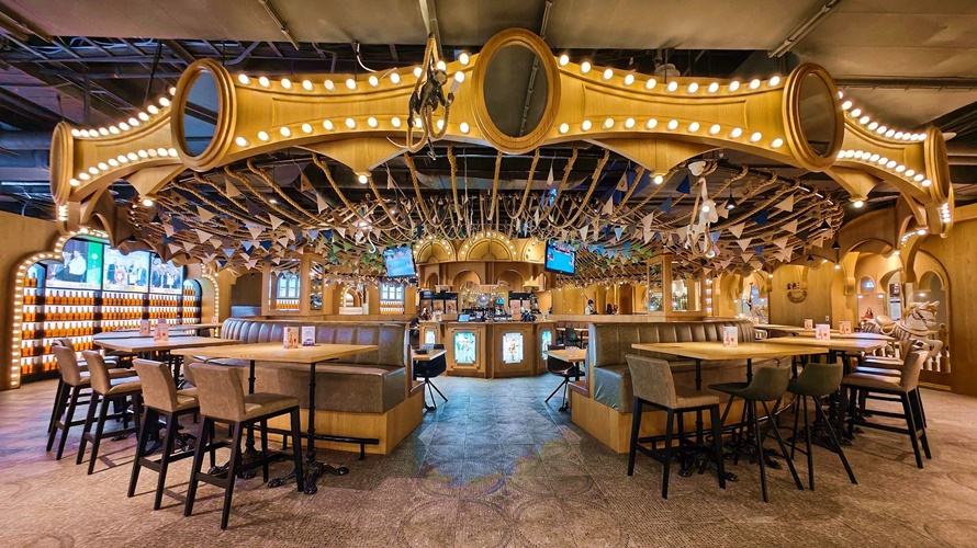 金色三麥義大店以馬戲團主題風格裝潢及經典大拼盤、蜂蜜啤酒等特色餐飲受好評。(圖/義大世界提供)