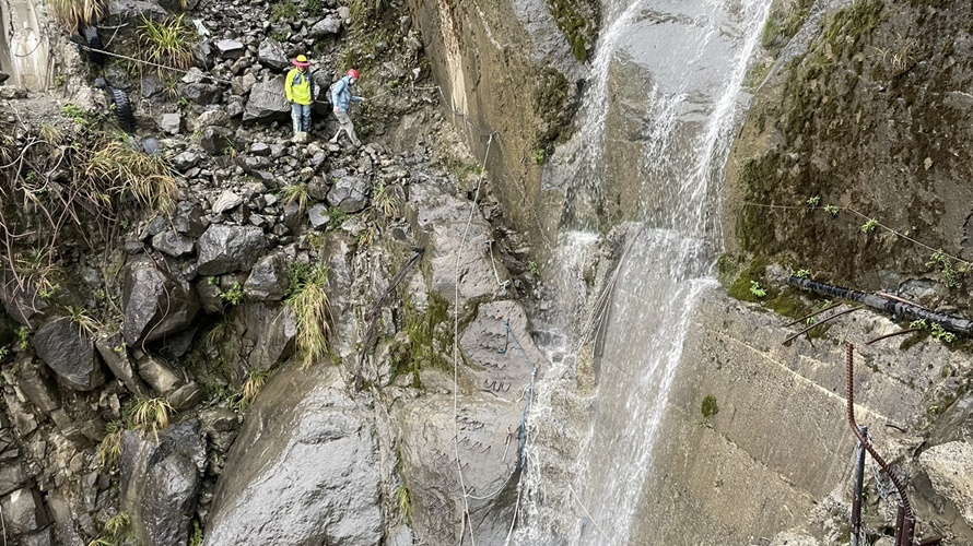 大雨導致眠月線崩塌處形成水瀑。(圖/嘉義消防提供)
