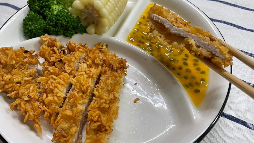 ▲經由同事的說明書,原PO跟著做,竟然是好吃又可療癒的科學麵炸豬排。(圖/翻攝爆廢公社)