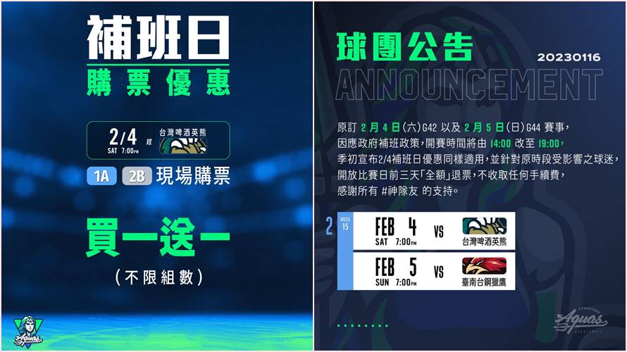 高雄全家海神隊4日交手台啤英熊隊,5日迎戰臺南台鋼獵鷹隊,因應補班,兩場賽事皆改於晚間7時於高雄巨蛋登場。4日補班日另推出購票優惠,現場購票享買一贈一,當日現場晚間5時開放購票。
