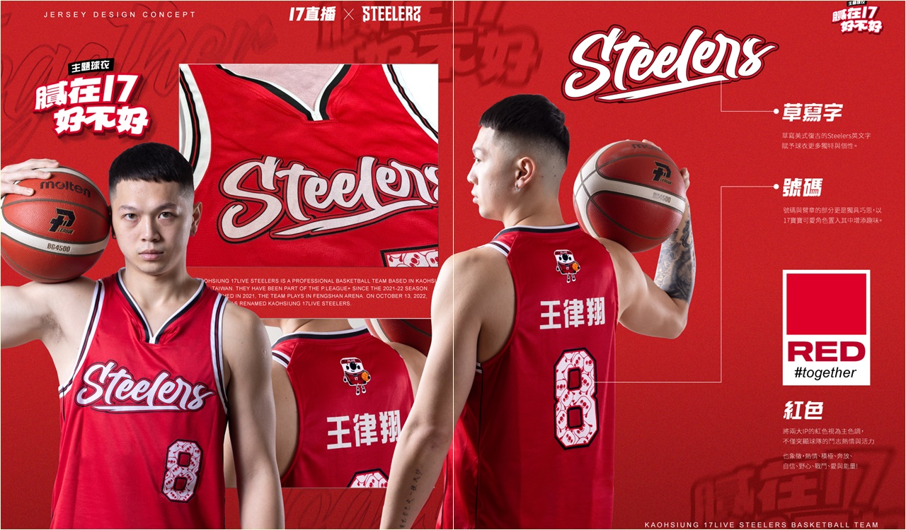 高雄17直播鋼鐵人2024年首個主場,將在本週末1月27、28日舉辦「膩在17好不好」17直播主題週,本次鋼鐵人與17直播聯手,希望能呈現夥伴、家人、朋友之間的感情,也如同球迷們對於鋼鐵人為最大支柱,這週末也呼籲球迷們進場膩在一起替鋼鐵人應援。而本週也特別推出「膩在17好不好」主題週球衣,使用鋼鐵人與17直播兩大IP的主要視覺色-紅色,突顯球隊的鬥志熱情與活力,寫美式復古的Steelers英文字賦予球衣更多獨特與個性,號碼的部分則以17寶寶可愛角色置入其中增添趣味,此款球衣也將在本週現場搶先開賣。