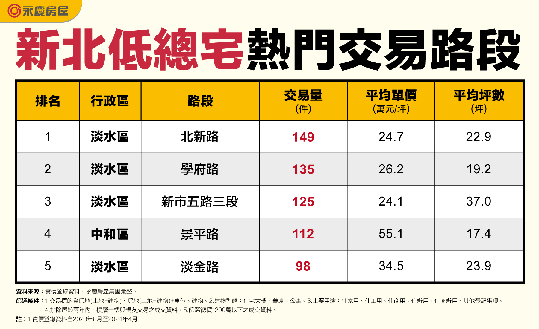 觀察新北市1200萬元以下熱門購屋路段前五名,有四路段由淡水區包辦,其中名列第一至三的北新路、學府路和新市五路三段交易量分別為149件、135件和125件,平均三天至少交易一件。陳金萍表示,雙北市中心的房價高,讓不少購屋族紛紛往市區外圍尋屋,而淡水區有捷運和輕軌經過、且房價親民,也成為首購族天堂,當中有許多路段相當受歡迎。