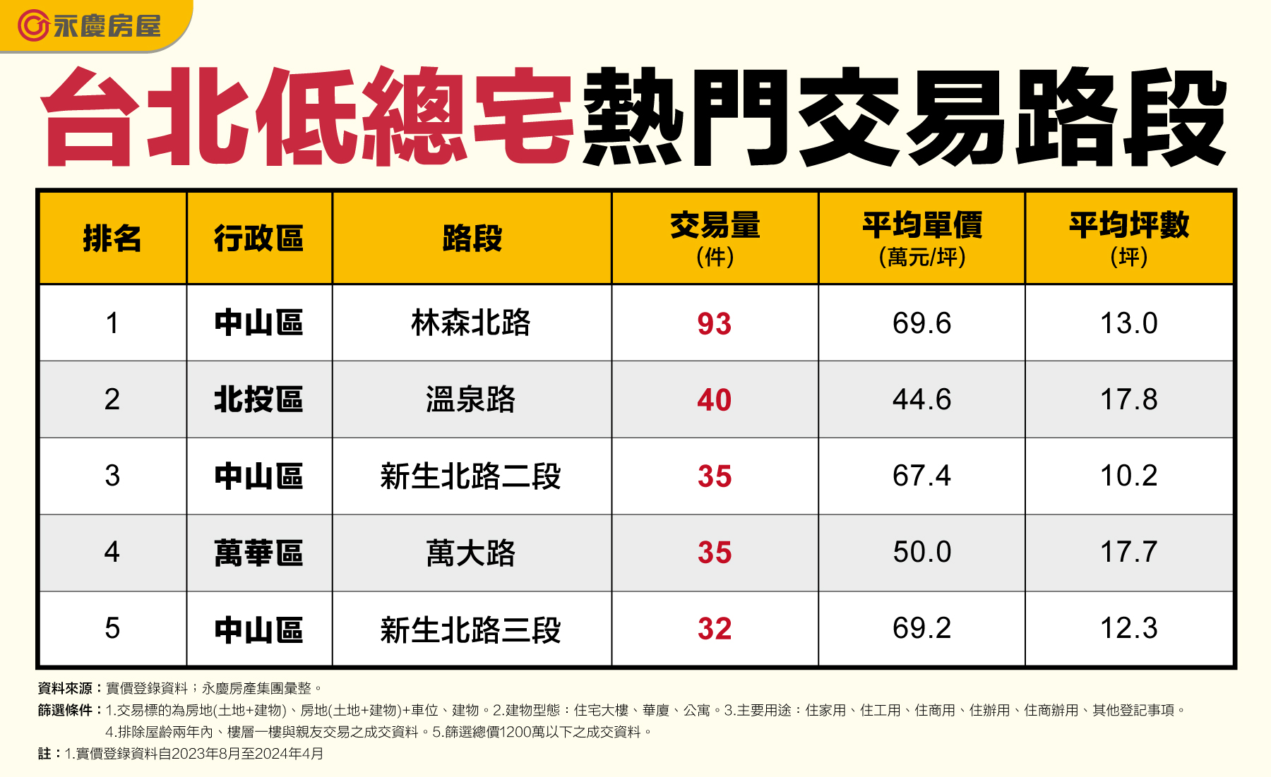 台北市總價1200萬元以下的前五名熱門交易路段,都是20坪以下的小宅。其中,中山區就占三席次,分別為第一名的林森北路和位居三、五名的新生北路二、三段。永慶房屋研展中心副理陳金萍指出,中山區匯集了四條捷運線交通便捷,公車路線多,商業、生活機能活絡,雖然位於蛋黃區,但區域內有不少小坪數、屋齡偏大的住宅可供選擇,造就區域房市熱絡。