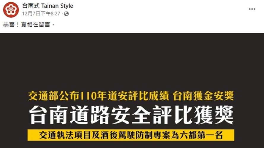 臉書粉專「台南式」對於台南獲金安獎貼文「恭喜!真相在留言」,果然在留言裡,「台南式」小編繼續寫「台南已連續22個月,蟬聯台灣每十萬人死傷人數第一名的寶座」,網友也毫不客氣「別搞笑了,每天出門後,能平安回到家都算是撿到一條命」、「笑死,如果沒有作票,那全台灣到底有多差」、「今日最大的笑話」、「這個榮耀是屬於克服先天限制,技術高超的廣大台南民眾」、「今天就遇到兩起車禍,一起在家門口。門口一側車禍,另一側則是被違規停車堵死,整條巷子都無法出入」、「看一下永康中華路根本違停天堂,自我感覺良好成這樣」。