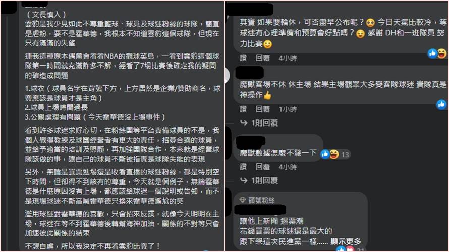 T1聯盟統計今日雲豹進場人數有15085人,這些球迷也轉向桃園雲豹粉專發洩,「魔獸客場不休休主場,結果主場觀眾大多變客隊球迷,貴隊真是神操作」、「不上場也不說,天氣這麼冷球迷從四面八方花錢坐車來,什麼都沒看到小,什麼打滿全場都在騙,不會經營球隊就換別人經營,把球迷當提款機嗎?」、「威廉不換掉絕不進場」、「明明知道大家都是來看Howard的,還不讓他上。」。
