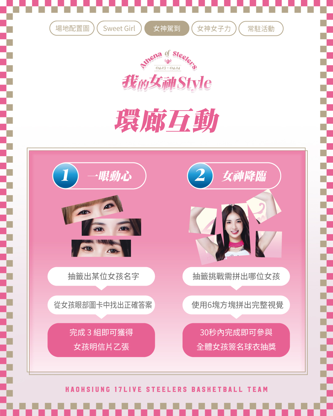 「我的⼥神Style」主題周,14日球團也特別舉辦本年度⾸次全體啦啦隊簽名,需持鋼鐵⼥神雅典娜官⽅商品⾄服務台,即可領取見面會簽名號碼牌,當日限量50名。環廊活動推出「⼀眼動⼼」、「⼥神降臨」,讓球迷能夠與鋼鐵女神雅典娜拉進距離,「⼀眼動⼼」現場完成對應圖片,可兌換⼥孩明信⽚⼄張;「⼥神降臨」,抽籤挑戰拼圖出正確⼥孩,即可參與全體⼥孩簽名球⾐抽獎。球迷憑票根可至場外體驗「少女心事」塔羅牌占卜,以及在地屢獲技藝競賽佳績的中山工商美容科提供的「閃閃惹人愛」編髮服務,讓每位進場的女孩後都能閃亮耀眼體驗主場氛圍。
