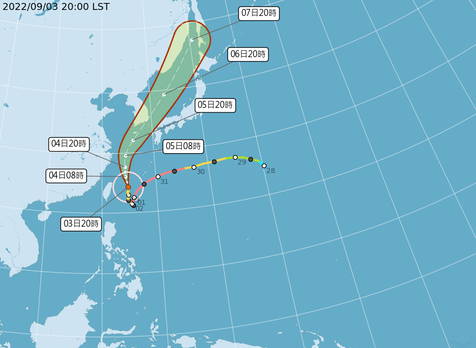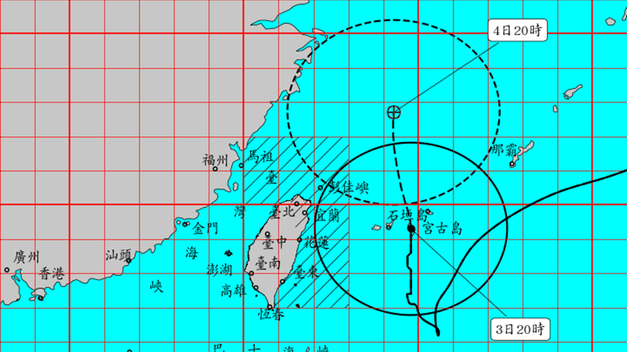 氣象局指出,3日20時的中心位置在北緯24.3度,東經124.8度,以每小時17公里速度,向北北西進行。中心氣壓930百帕,近中心最大風速每秒48公尺,瞬間最大陣風每秒 58 公尺,七級風暴風半徑 280 公里,十級風暴風半徑 100 公里。