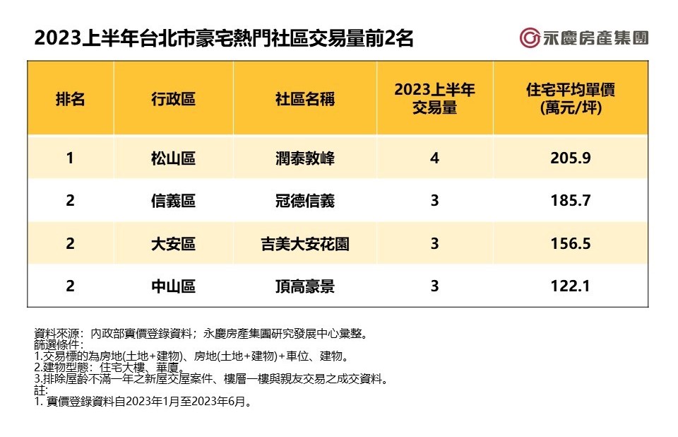 在經濟前景不明和新法限制下,豪宅市場已成個案表現。分析2023上半年的豪宅交易狀況,前四名豪宅社區撐起台北市13.5%的豪宅交易量。其中交易量第一是位於松山區的「潤泰敦峰」,而「吉美大安花園」、「冠德信義」、「頂高豪景」則分別以3筆交易量並列亞軍。