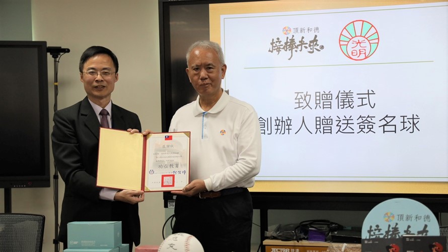 ▲光明國中校長何信璋(左一) 、頂新和德文教基金會魏應充創辦人(右一),感謝基金會長期對於基層棒球的回饋。