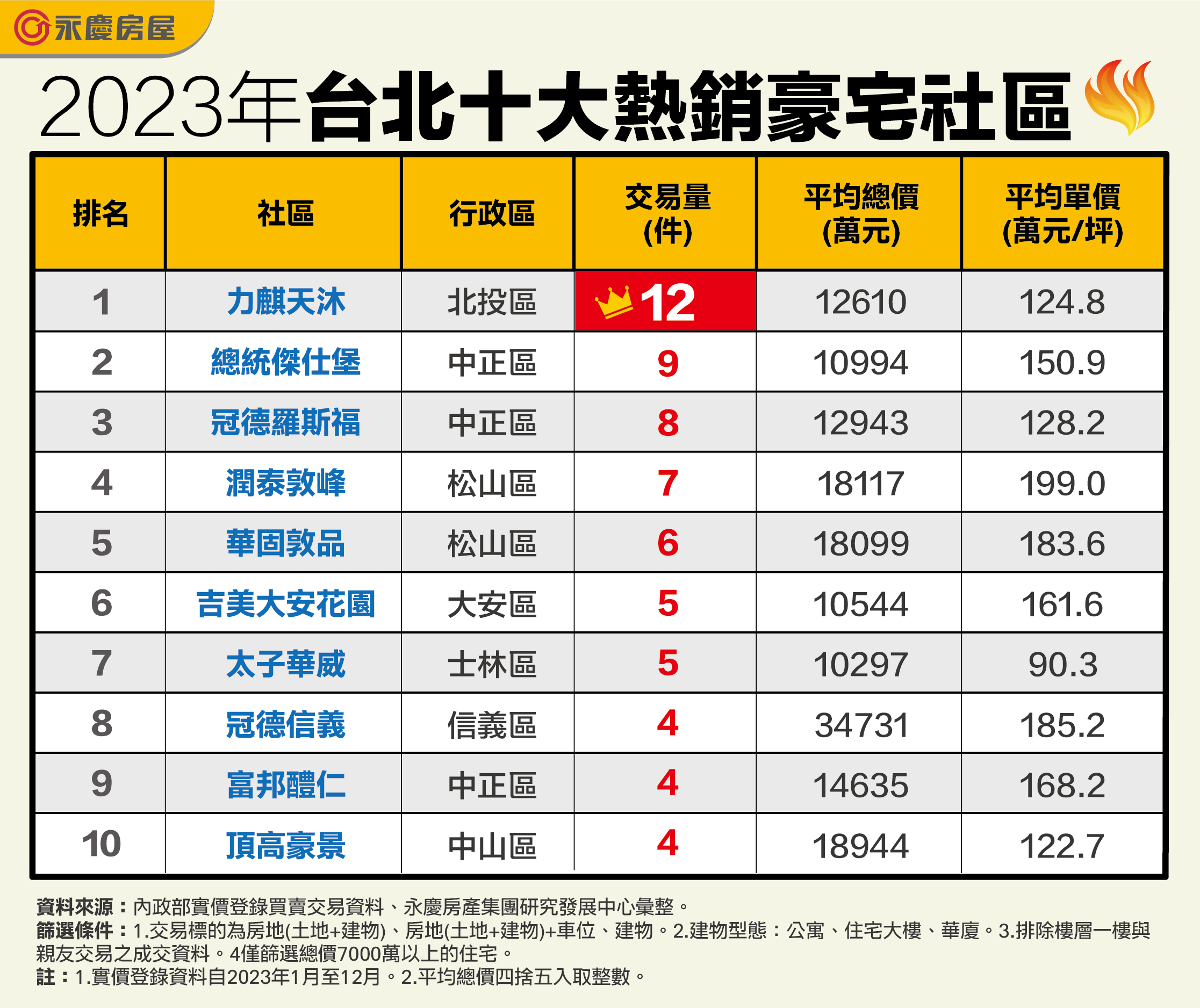 2023年北市賣最多的豪宅在北投! 平均每月成交1件 中正區北市唯一3社區入榜! 「潤泰敦峰」均價為北市之最!