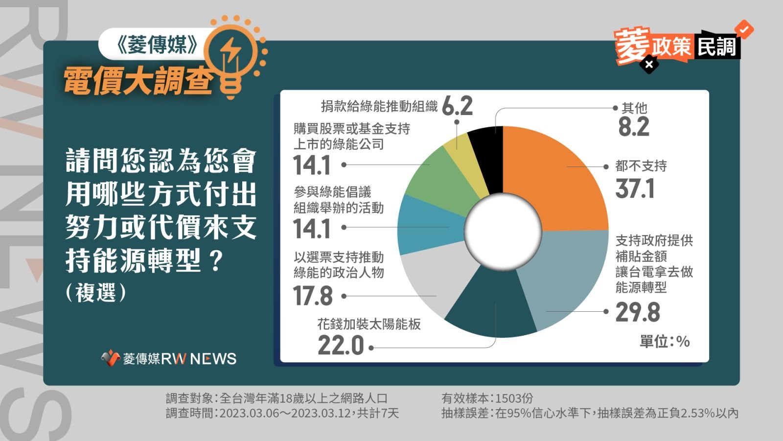 支持能源轉型的民眾當中,29.8%支持政府提供補貼金額讓台電拿去做能源轉型、22%願意花錢加裝太陽能板支持能源轉型、17.8%會以選票支持推動綠能的政治人物、14.1%會參與綠能倡議組織舉辦的活動、14.1%會購買股票或基金支持上市的綠能公司、6.2%會捐款給綠能推動組織。