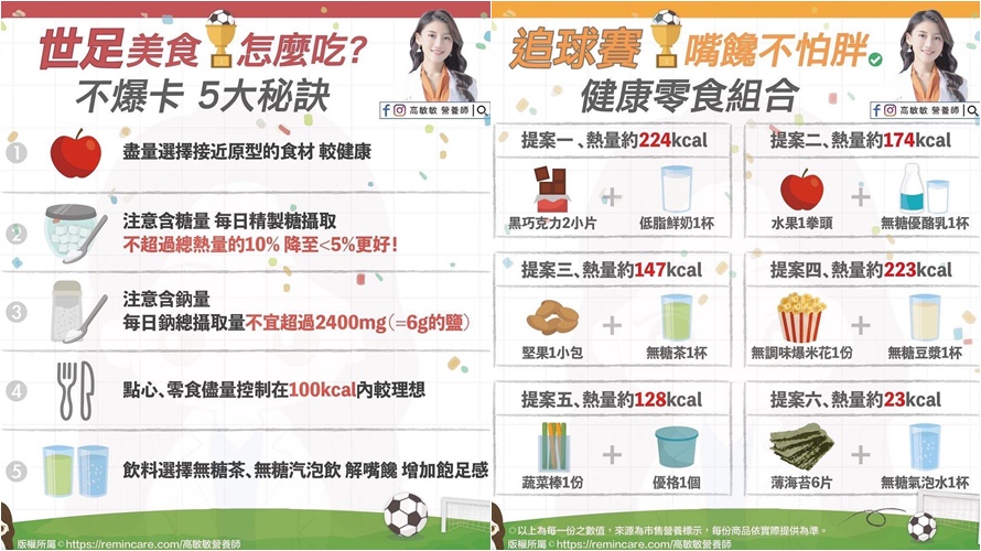 世界盃足球賽目前已進展到4強賽,由於台灣與卡達的時差,讓不少球迷都熬夜看球,營養師高敏敏就分享常見的消夜美食熱量表,以及5種吃不胖的秘訣。
