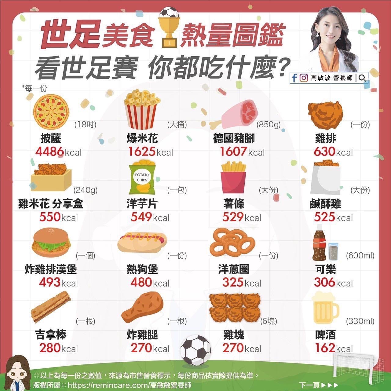 包含披薩(18吋)有4486kcal、爆米花(大桶)1625kcal、德國豬腳(850g)1607kcal、雞排(一份)630kcal、雞米花分享盒(240g)550kcal、洋芋片(100g)549kcal、薯條(大份)529kcal、鹹酥雞(大份)525kcal、炸雞排漢堡(一個)493kcal、熱狗堡(一份)480kcal、洋蔥圈(一份)325kcal、可樂(600ml)306kcal、吉拿棒(一根)280kcal、炸雞腿(一根)270kcal、雞塊(6塊)270kcal、啤酒(330ml)162kcal。