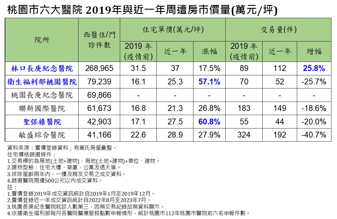 在高齡化和疫後健康、醫療服務需求的影響下,醫療資源易得性已經成為許多長輩、家長購屋考量條件之一。一般而言,就診醫病患多代表該醫院的醫療量能較佳,有巢氏房屋根據衛生福利部就診資料,盤點出桃園市6間大型醫院,並比較醫院周邊在疫情前後的房市變化。永慶房產集團研展中心副理陳金萍指出,「林口長庚醫院」不只規模大、就診人數和員工人數也多,支撐當地房市剛需強勁,交易量逆勢成長25.8%;「聖保祿醫院」周邊房價在疫情前後則有60.8%漲幅,成長幅度驚人,可見醫療宅議題備受青睞。