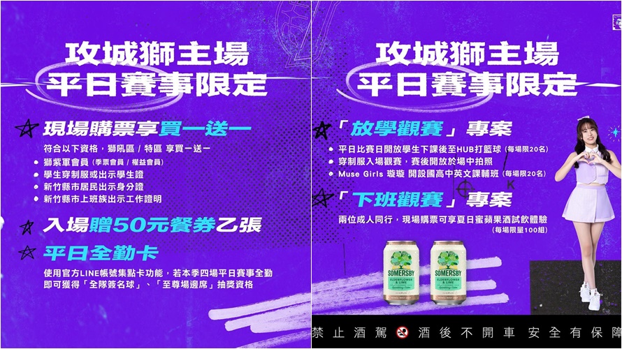 另外,平日賽事限定又分為兩大主題,攻城獅球團為學生族群與上班族量身打造平日看球計畫!「放學觀賽」專案將開放平日比賽日20位在地學生課後至LIONEERS HUB打籃球,且只要穿著制服進場看球,可在賽後進入一樓場中拍照!為鼓勵學生族群熱愛籃球的同時也能兼顧課業,球團特別安排自國立陽明交通大學外文系研究所畢業的Muse Girls 璇璇,開設英文課後輔導班(限量20位),盼學生獅紫軍把握賽事空檔精進外語能力。「下班觀賽」專案則是提供前100組上班族,只要兩人同行進場,即享夏日蜜蘋果酒體驗試飲,歡迎所有獅紫軍平日晚間踴躍進場。