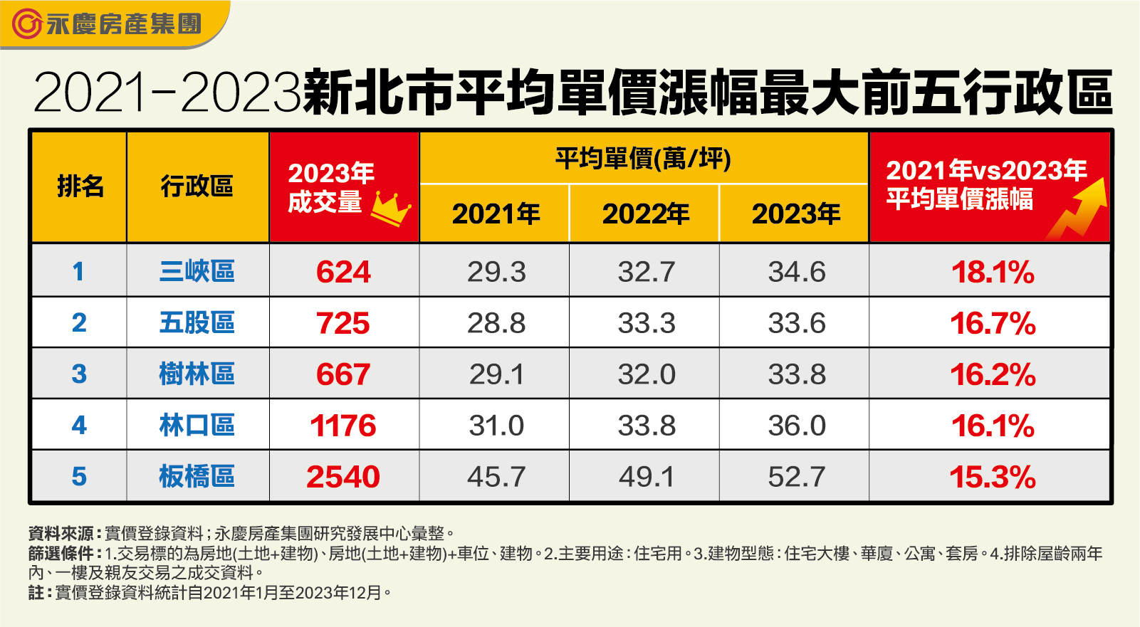 2021年經濟前景看好,房市動能熱絡,而2022年隨著央行利率走高、房市政策出籠,市場氛圍也轉趨保守,但房價依舊持穩未跌,並延續漲勢至2023年。永慶房產集團根據實價登錄,觀察近三年房市,整理出雙北行政區均價增幅前五名。其中,由松山區以漲幅10.1%奪下台北市房價漲幅冠軍,新北市則由三峽區以漲幅18.1%名列第一。