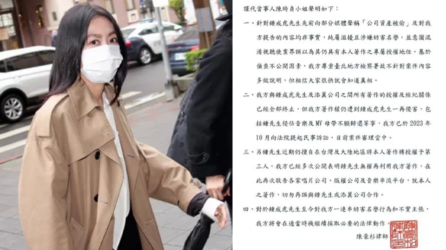 歌手陳綺貞遭前男友兼「添翼創越工作室」負責人鍾成虎提告,指控侵犯著作權法,雙方於7日在台北地檢署進行開庭。陳綺貞事後委託律師發表聲明,強調她與鍾成虎及添翼公司的所有著作授權及經紀關係已全面終止。聲明中指出,陳綺貞的著作權仍然受到鍾成虎的侵害,包括音樂及MV母帶被侵佔不歸還等事宜。她透露,已於2023年10月向法院提起相關的民事訴訟,目前案件正在審理中。