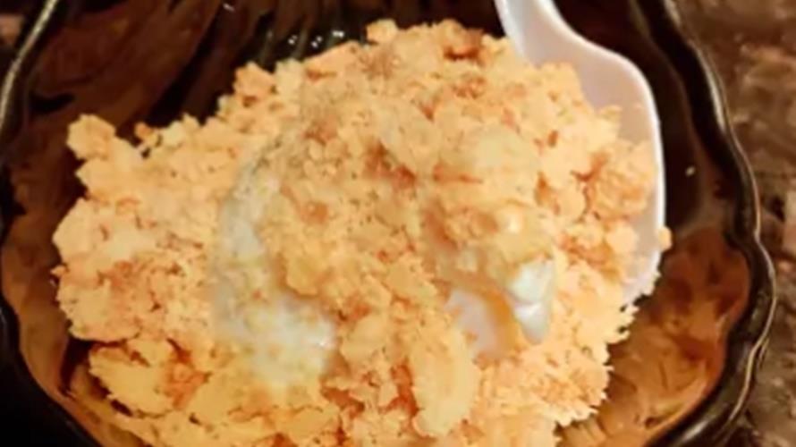 原PO在Dcard發想吃海底撈時發現的驚人甜點,因為和同事去吃宵夜,沒有很餓的情況下,原PO先攻冰淇淋,挖冰的時候剛好看到旁邊一直以來都不一定會拿的「鹹蛋黃餅」,靈機一動覺得可以捏碎灑在香草冰淇淋上,沒想到一吃驚為天人,鹹蛋黃的香氣加上捏碎的餅乾碎片,增加口感層次,搭配冰冰涼涼的香草冰淇淋,鹹鹹甜甜意外的超搭!