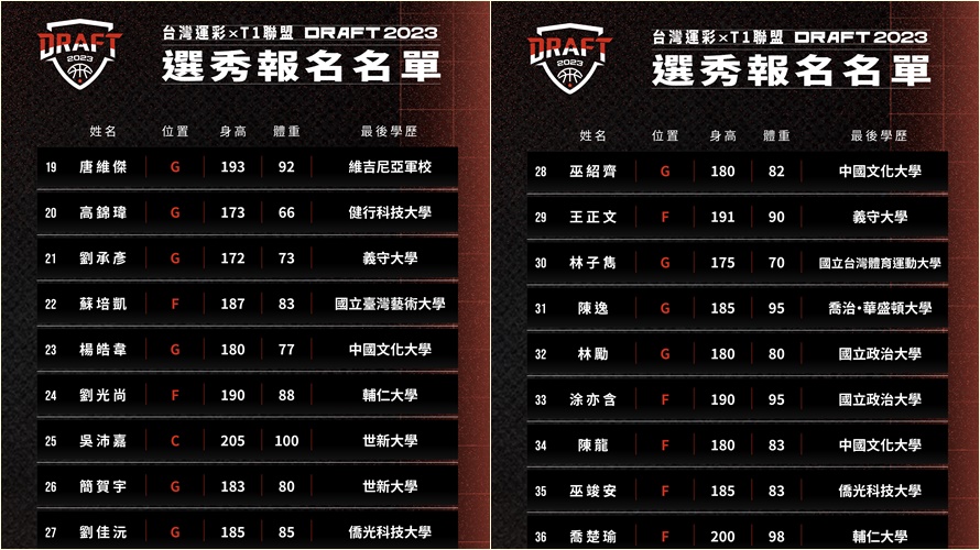 T1聯盟新人選秀會報名期限已於昨(26日)中午截止,共有47人投遞報名表,其中43名本土球員符合報名資格,包括UBA好手臺灣師大林信寬,健行科大高錦瑋、丁冠皓,世新大學簡賀宇、吳沛嘉,政治大學林勵、涂亦含,維吉尼亞軍校的旅外好手唐維傑與輔仁大學喬楚瑜皆名列其中。